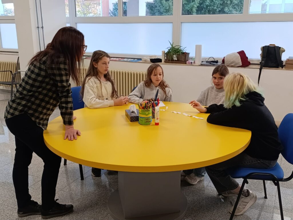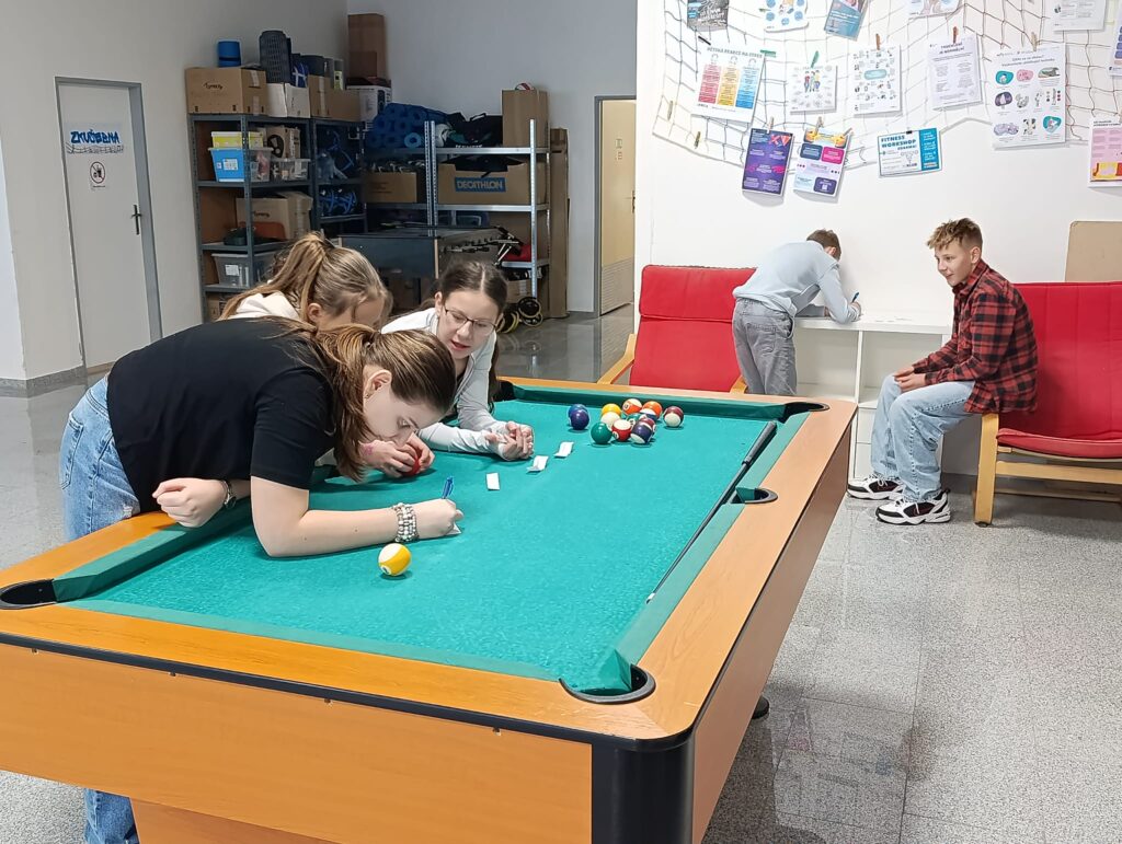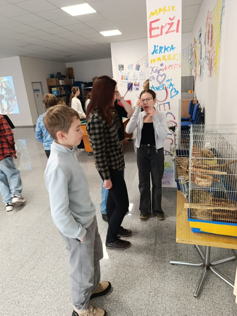 Pak se šesťáci rozdělili do skupinek a z vylosovaných slov vymýšleli nápadité, a mnohdy vtipné, příběhy. Následovala volná zábava, a tak se děti rozběhly do všech koutů centra. Někdo se věnoval hlodavcům v kleci, jiní hráli ping pong, fotbal s plyšovým míčem, kulečník nebo stolní hry.