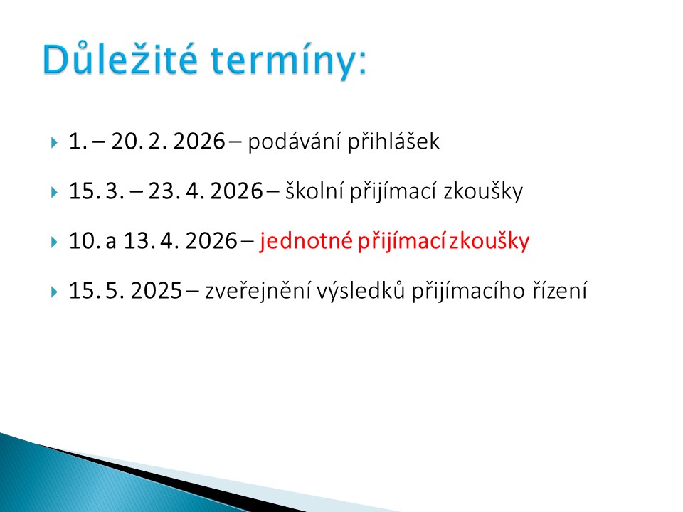 www.prihlaskynastredni.cz –informační web pro rodiče a žáky, kde jsou všechny důležité informace k přijímacímu řízení na SŠ, včetně videí a odkazů na stažení potřebných dokumentů (lékařský posudek zdravotní způsobilosti, hodnocení na vysvědčení, tiskopis přihlášky ad.)
