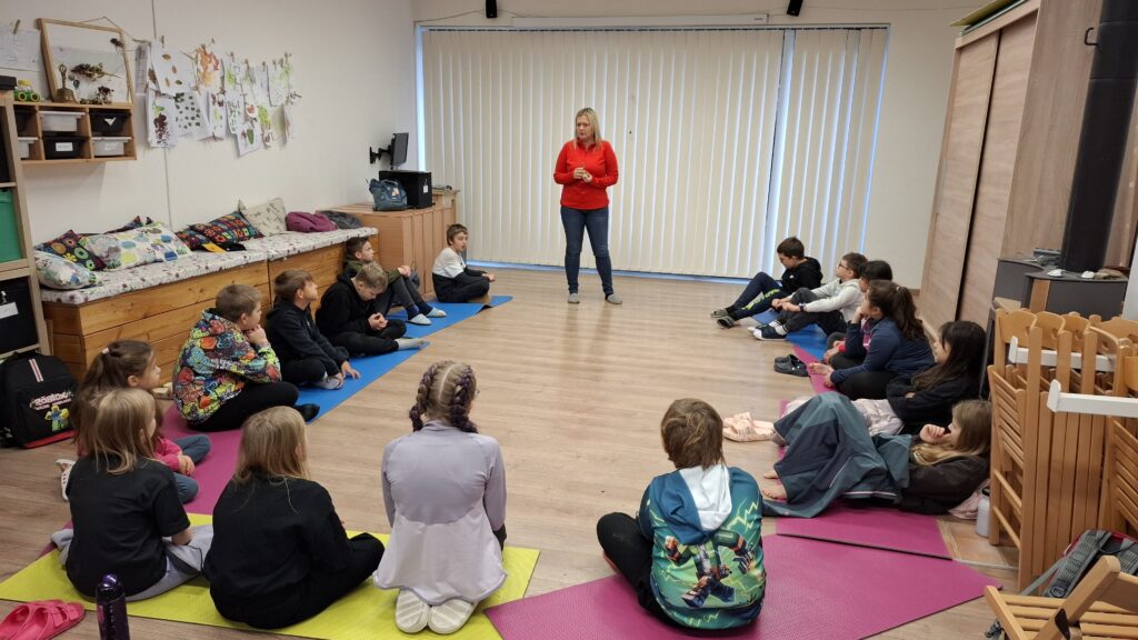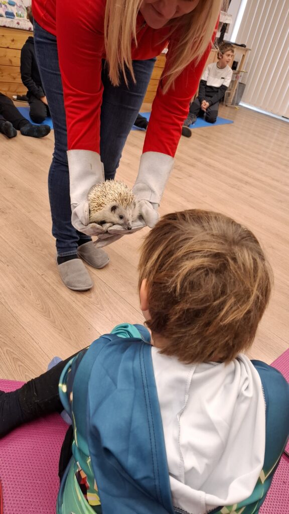 Po svačině jsme si povídali o zvířatech, která tam mají. Paní, která si tam s námi povídala nám řekla, proč tam některá zvířat jsou. Pak jsme hráli pantomimu. Potom paní přinesla ježka, který byl v kleci. Ježka z klece vytáhla a z blízka nám ho ukázala. Zároveň nám vyprávěla, čím se ježci živí, jak žijí a jak se k nim na podzim a v zimě máme chovat. Potom jsme šli ven, kde jsme si zahráli hru a povídali si o dalších zvířatech.