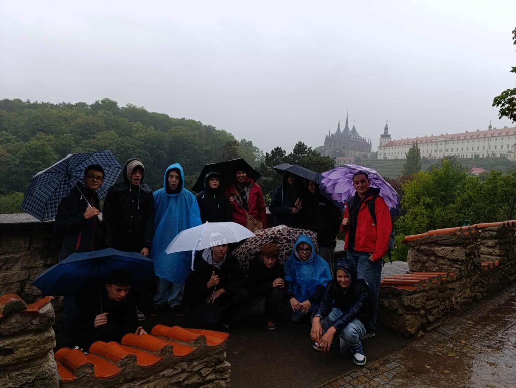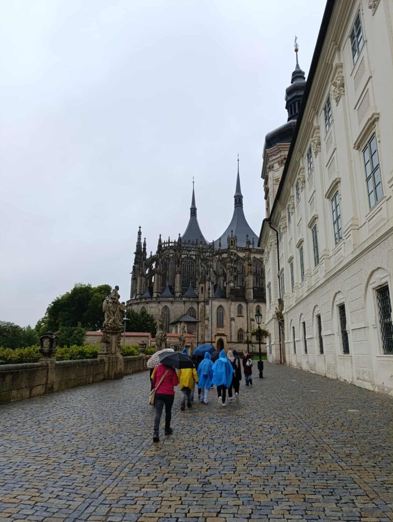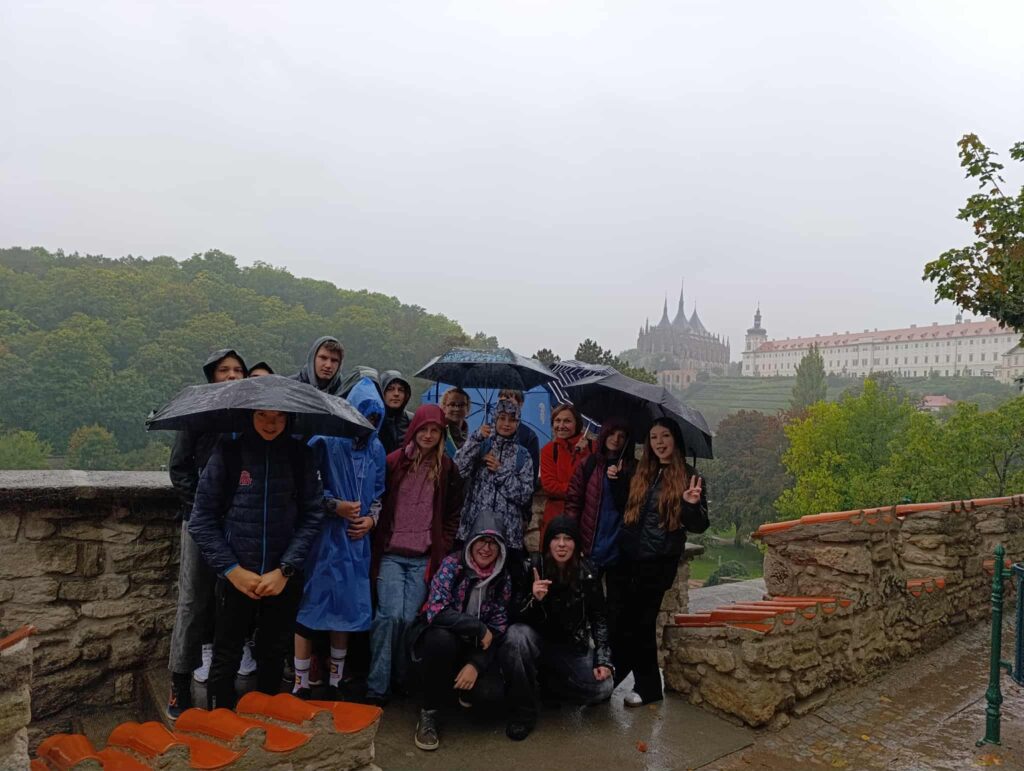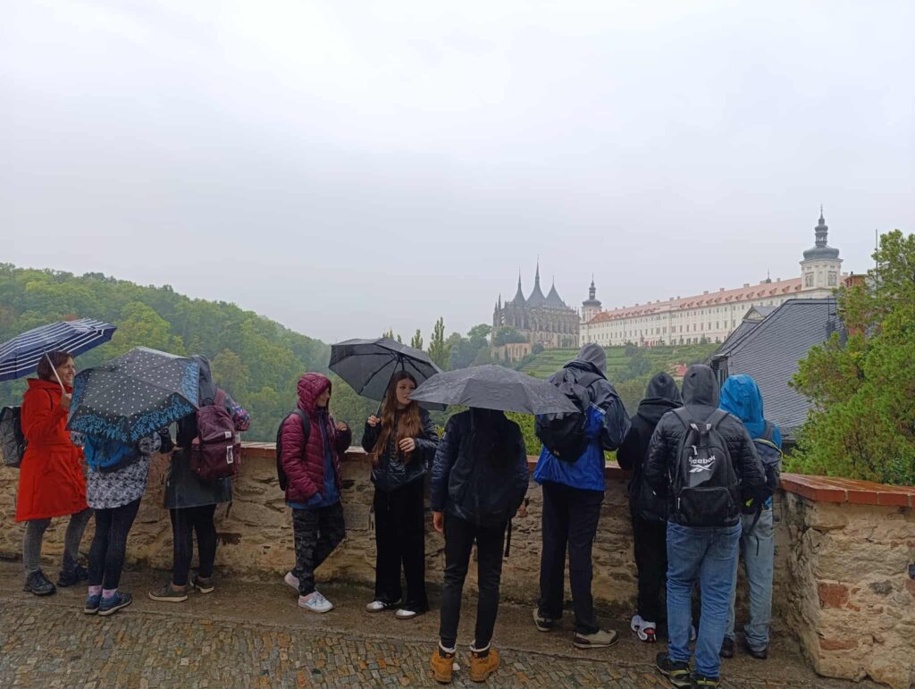 Zeměpisná exkurze 8. B a 8. C bohužel vyšla na chladný deštivý den. Památky města jsme si tedy prohlíželi s deštníky nebo zabaleni v pláštěnkách. Venkovní aktivity jsme omezili, ale cestou od vlakového nádraží jsme viděli Kostel Matky Boží Na Náměti, sady Dr. Bedřicha Pacáka u Vlašského dvora a chrám sv. Barbory, památku UNESCO.