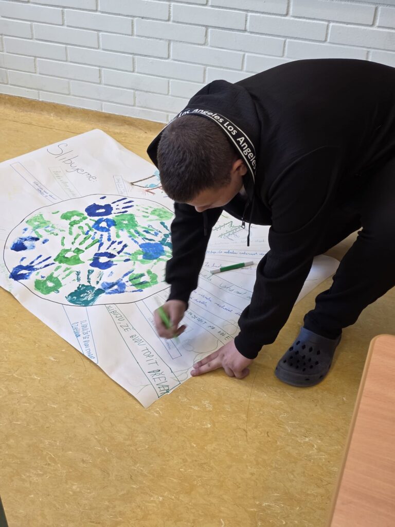 V rámci VV a ČSP vznikly originální výkresy s touto tematikou. Žáci společně vytvořili velký třídní plakát se „sliby pro Zemi“, kde každý žák formuloval konkrétní závazek, jak bude svým chováním přispívat k ochraně životního prostředí. Třída se v době odpoledního vyučování vydala uklidit okolí školy. Podařilo se nasbírat několik pytlů odpadu a žáci si na vlastní kůži uvědomili, jak důležité je udržovat své okolí čisté. V ČJ jsme na závěr vypracovali pracovní list věnovaný tomuto dni.