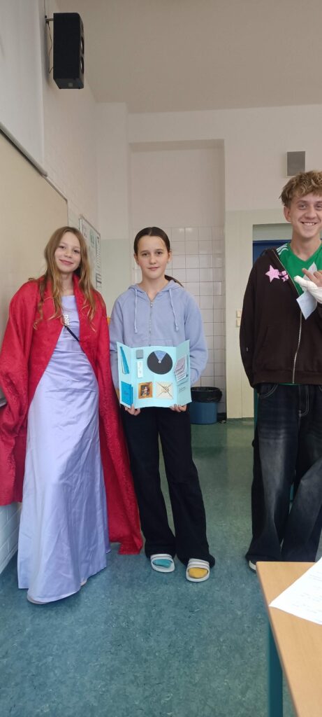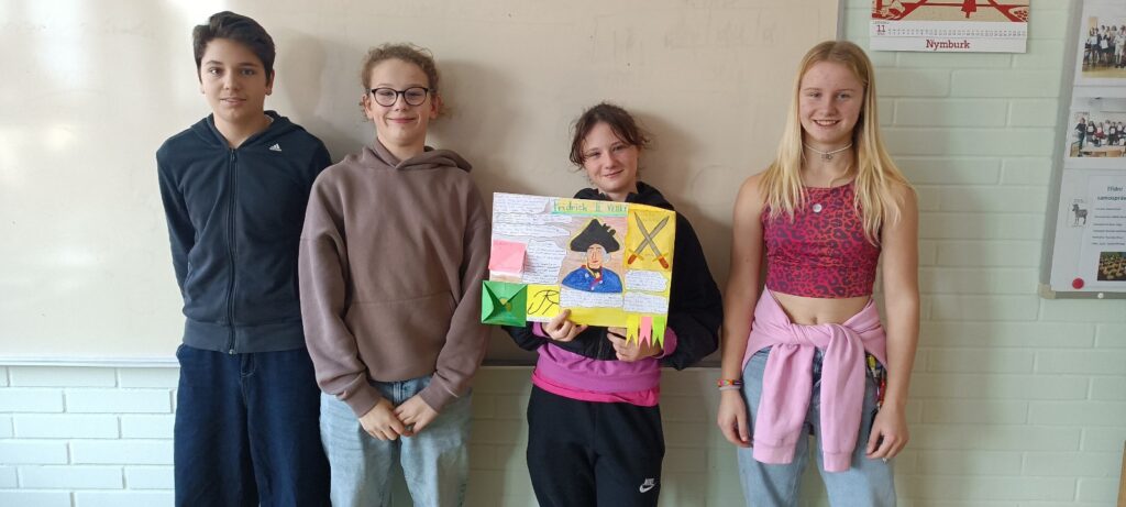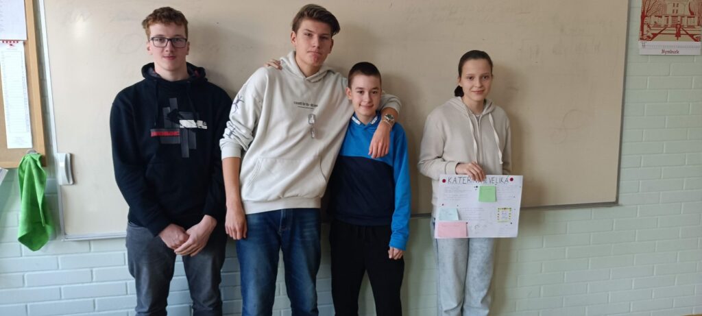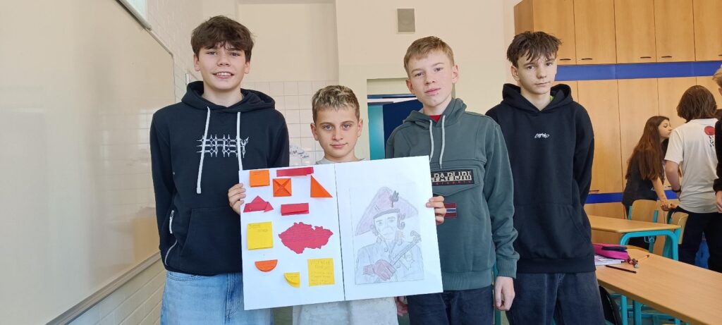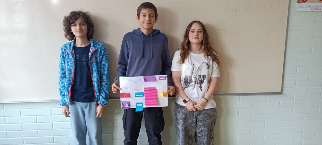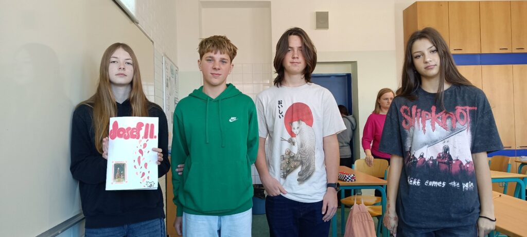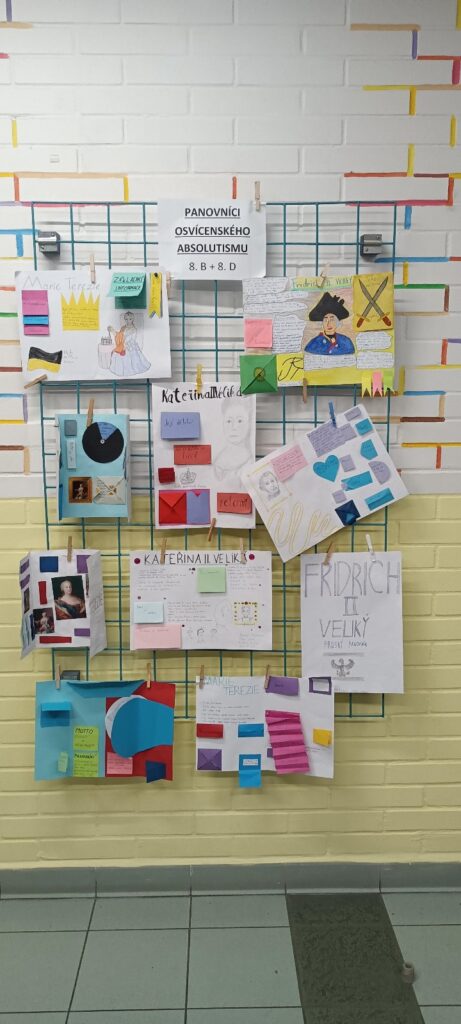 Žáci ve skupinách nastudovali základní informace o Marii Terezii, Kateřině Veliké, Fridrichu Velikém a Josefu II. Tyto poznatky pak přenesli na čtvrtku a zpracovali je formou lapbooku — interaktivní práce obsahující otevírací okénka, skládačky a další prvky.