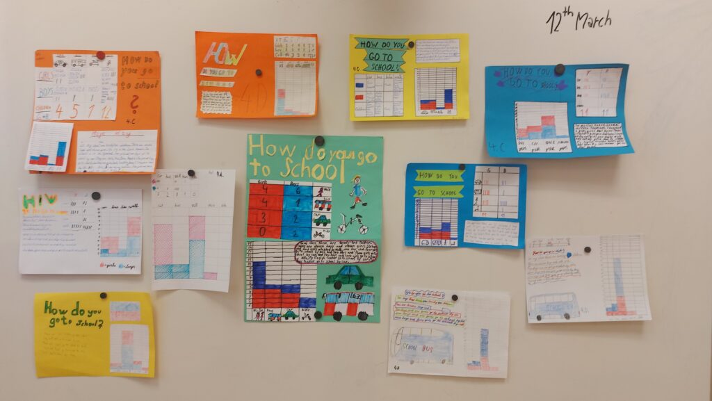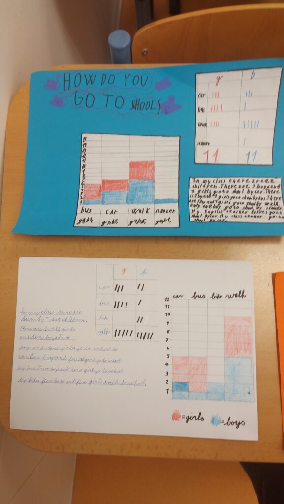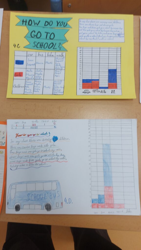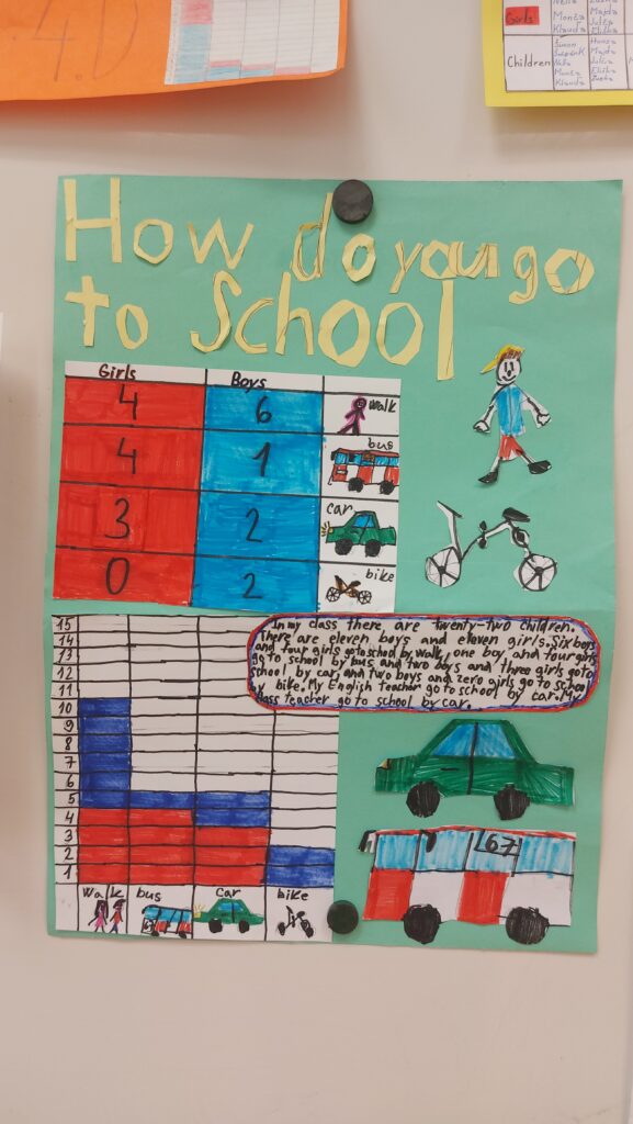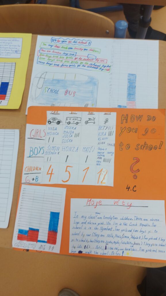 Součástí projektu byl i sběr dat (dotazování spolužáků), počítání, tabulka, graf, písemné zpracování i samotná prezentace – vše v anglickém jazyce. Tedy matematika a geometrie v anglickém jazyce (metoda CLIL). Výsledek průzkumu ve všech 4. třídách ukázal, že většina dětí chodí do školy pěšky.