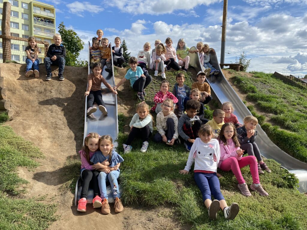 Prvňáci vyrazili se školní družinou na první výlet, který je zavedl na hřiště Nezlobiště. Počasí přálo, času bylo dost a tak děti stihly prozkoumat všechny prvky a sestavy, které hřiště nabízí.