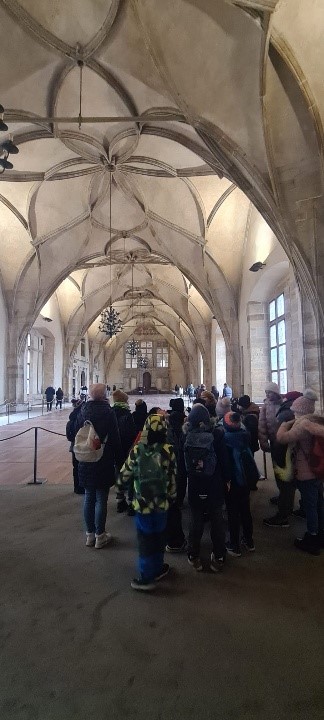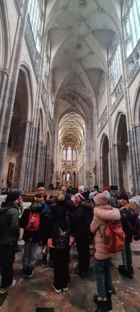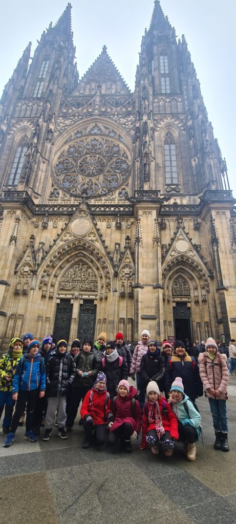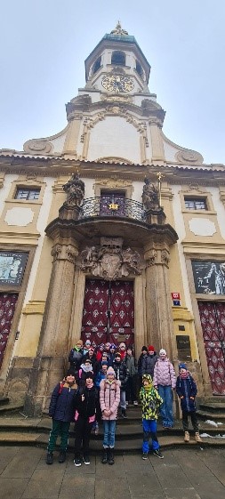 Na školním výletě jsme navštívili Pražský hrad s komentovanou prohlídkou chrámu sv. Víta a Starého královského paláce. Výlet začal na Pohořelci u sochy Keplera a Tycha Brahe (astronomů a astrologů Rudolfa II.). Následovala pověst o hraběnce, která běhá sklepeními barokního Černínského paláce v rozpálených střevíčkách, které si nechala upéct z chleba. U svaté Lorety jsme byli příliš brzy, přesto nás nechal správce nahlédnout ke Svaté chýši. Pražské (Zlaté) Slunce jsme viděli jen na obrázku. Loretánskou zvonkohru jsme slyšeli celou i s pověstí o chudé vdově. Prošli jsme Nový svět, kolem domku vdovy a domu, kde pobýval Tycho Brahe až na Hradčanské náměstí. Na Pražském hradě se nás ujala průvodkyně. V chrámu svatého Víta jsme si zopakovali nejstarší dějiny. Viděli jsme hroby Přemyslovců, ale i sv. Jana Nepomuckého, královskou lóži a nejvýznamnější kapli sv. Václava. Ve Starém královském paláci jsme neviděli jen Vladislavský sál, ale i Ludvíkovo křídlo (královské ložnice), Starou sněmovnu s kopii korunovačních klenotů a královský trůn. V Bazilice svatého Jiří jsme si prohlédli odlitek plastiky kněžny Ludmily z gotického náhrobku. Zlatou uličkou jsme došli k hladomorně Daliborka a po Zámeckých schodech jsme se vydali na cestu zpět.